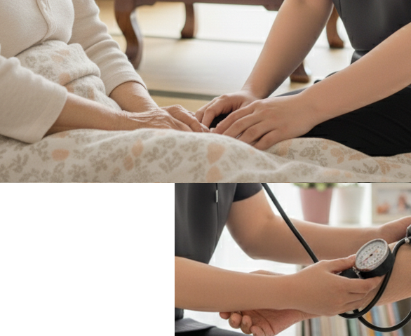 病状の観察、服薬管理、清潔ケア、リハビリ、褥瘡(じょくそう)ケア、終末期・看取り支援などを行います。かかりつけ医やケアマネジャーと連携しながら、安心して在宅で過ごせるよう支援します。